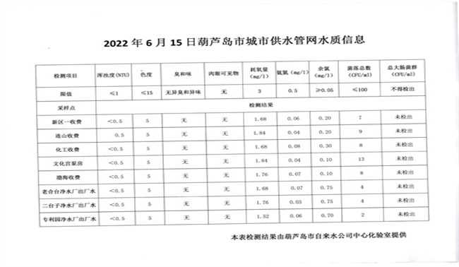 2022年6月15日葫蘆島市城市供水管網(wǎng)水質(zhì)信息