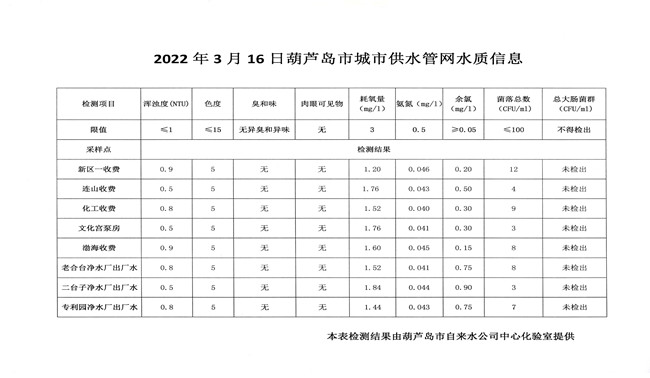 2022年3月16日葫蘆島市城市供水管網(wǎng)水質(zhì)信息