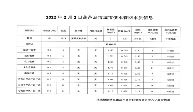 2022年2月2日葫蘆島市城市供水管網(wǎng)水質(zhì)信息