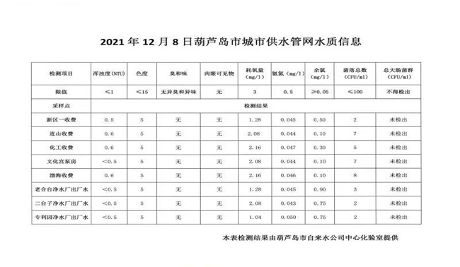 2021年12月8日葫蘆島市城市供水管網(wǎng)水質信息