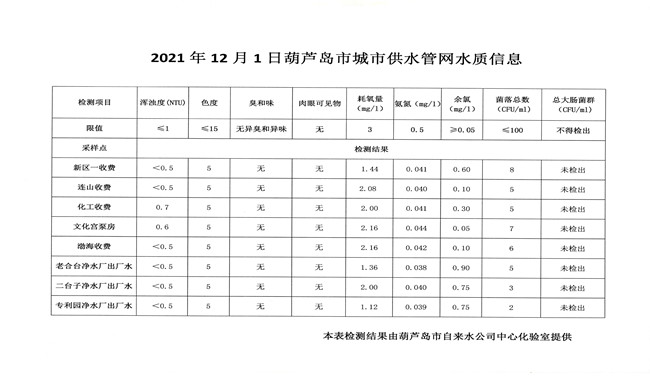 2021年12月1日葫蘆島市城市供水管網(wǎng)水質信息