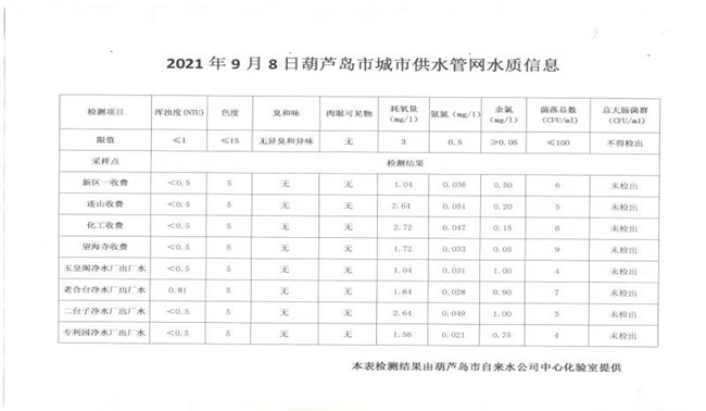 2021年9月8日葫蘆島市城市供水管網(wǎng)水質(zhì)信息