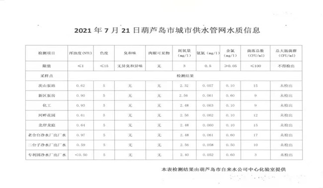2021年7月21日葫蘆島市城市供水管網水質信息