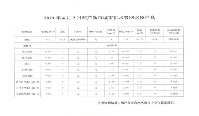 2021年4月7日葫蘆島市城市供水管網(wǎng)水質(zhì)信息