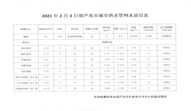 2021年2月3日葫蘆島市城市供水管網(wǎng)水質(zhì)信息