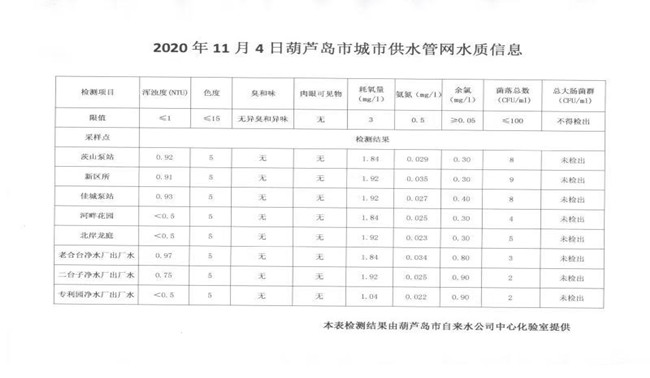 2020年11月4日葫蘆島市城市供水管網(wǎng)水質(zhì)信息