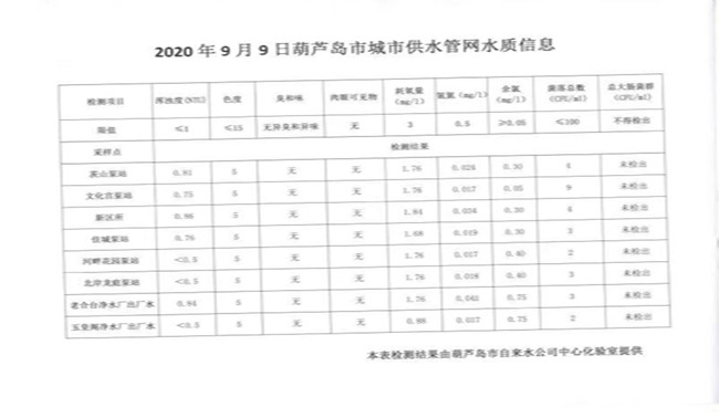 2020年9月9日葫蘆島市城市供水管網(wǎng)水質(zhì)信息