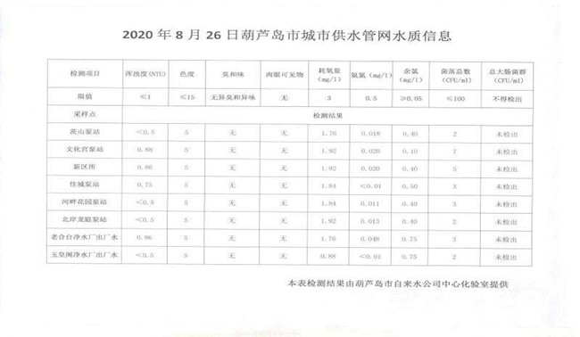 2020年8月26日葫蘆島市城市供水管網(wǎng)水質(zhì)信息
