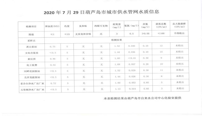 2020年7月29日葫蘆島市城市供水管網(wǎng)水質(zhì)信息