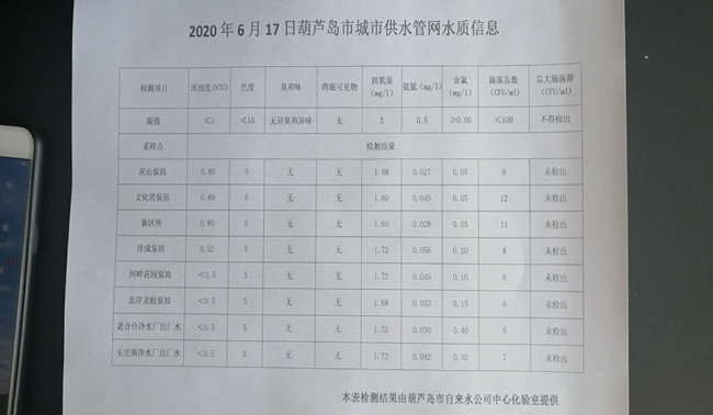 2020年6月17日葫蘆島市城市供水管網(wǎng)水質(zhì)信息
