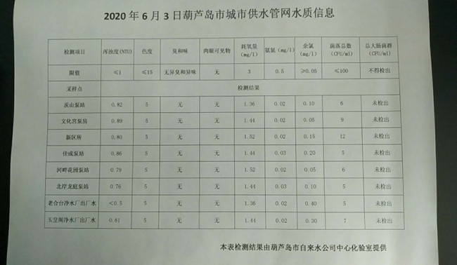 2020年6月3日葫蘆島市城市供水管網(wǎng)水質(zhì)信息