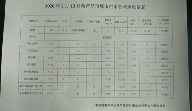 2020年5月13日葫蘆島市城市供水管網(wǎng)水質(zhì)信息