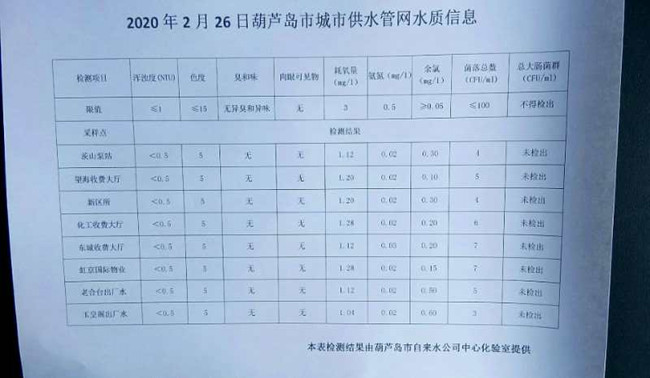 2020年2月26日葫蘆島市城市供水管網(wǎng)水質(zhì)信息