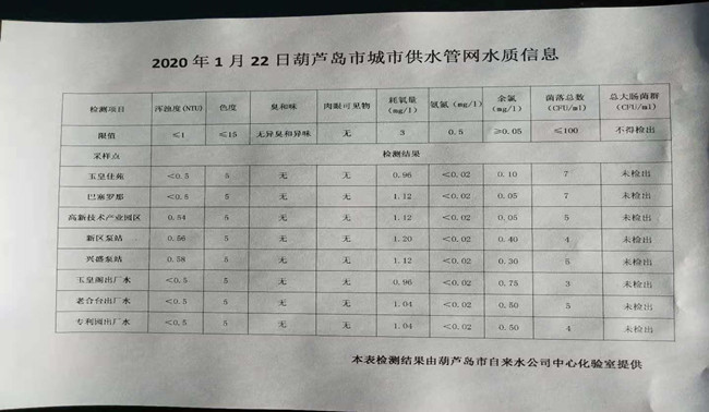 2020年1月22日葫蘆島市城市供水管網(wǎng)水質(zhì)信息