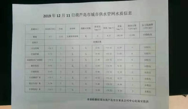 2019年12月11日葫蘆島市城市供水管網(wǎng)水質(zhì)信息