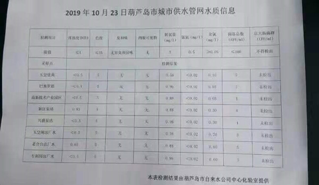 2019年10月23日葫蘆島市城市供水管網水質信息