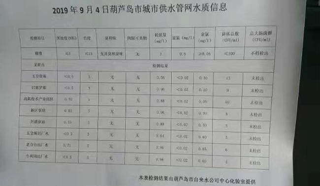 2019年9月4日葫蘆島市城市供水管網(wǎng)水質(zhì)信息