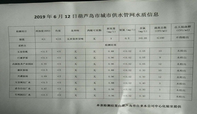2019年6月12日葫蘆島市城市供水管網(wǎng)水質(zhì)信息