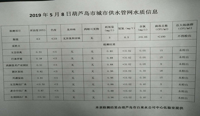 2019年5月8日葫蘆島市城市供水管網(wǎng)水質(zhì)信息