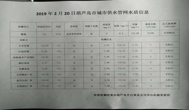 2019年2月20日葫蘆島市城市供水管網(wǎng)水質(zhì)信息