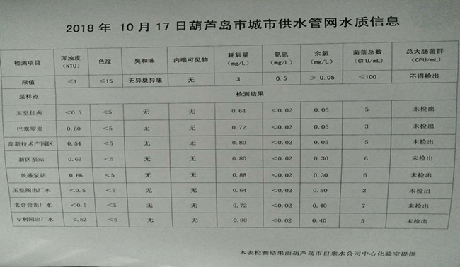 2018年10月17日葫蘆島市城市供水管網(wǎng)水質(zhì)信息