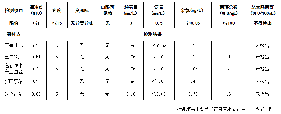 2017年10月18日葫蘆島市城市供水管網(wǎng)水質(zhì)信息