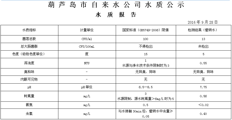 2016年9月第四周 水質(zhì)報(bào)告