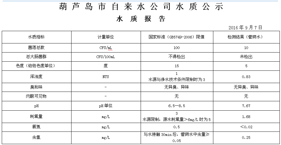 2016年9月第1周 水質(zhì)報(bào)告